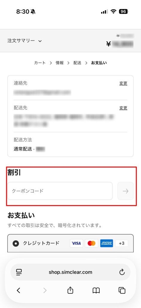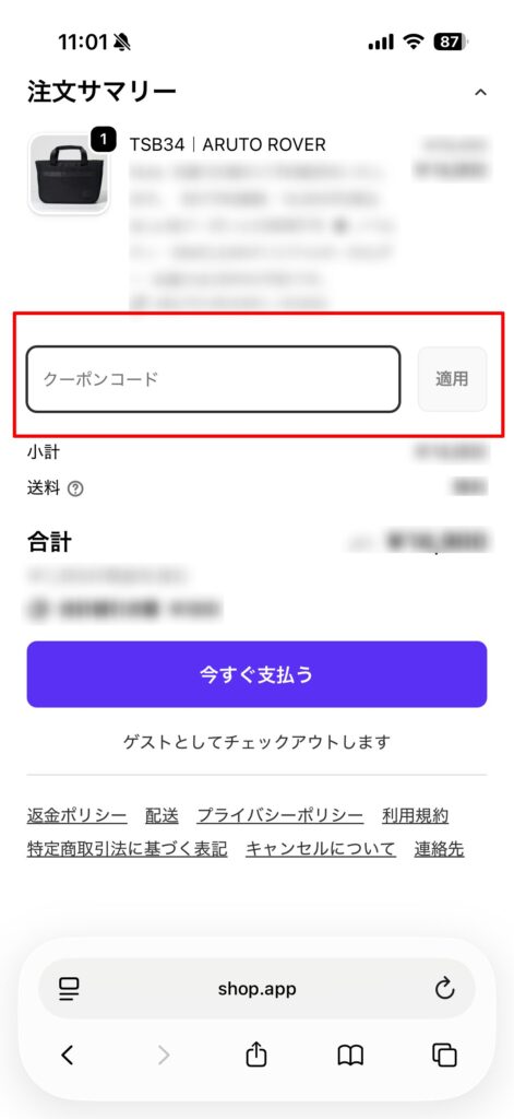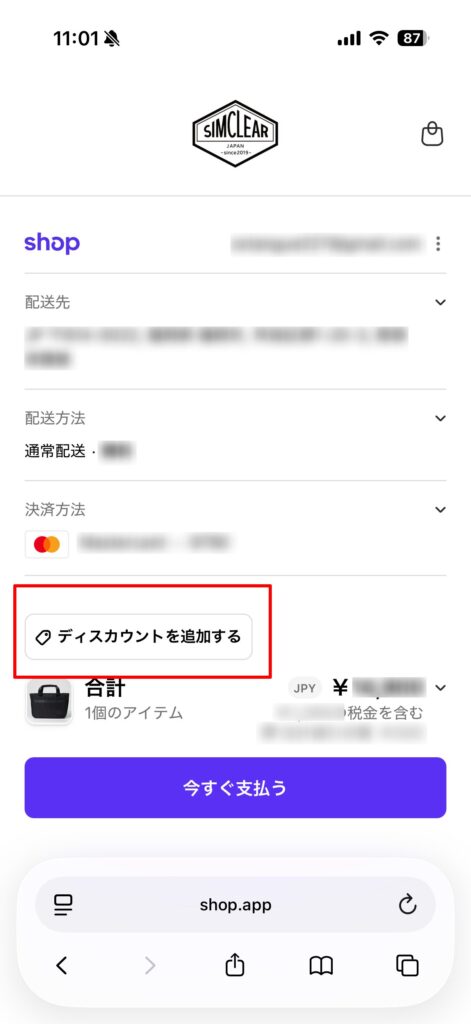 shopIDをお持ちの場合、既にログインをされている場合はお支払い画面で「ディスカウントを追加する」をタップし、表示された入力欄へクーポンコードをご入力ください。