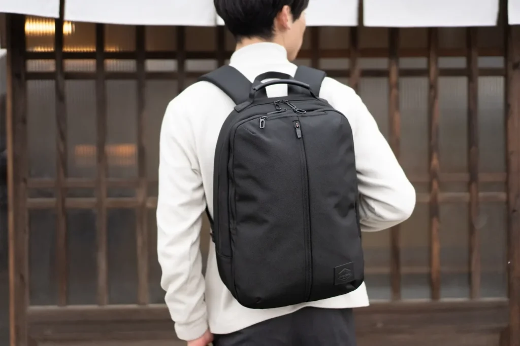 仕事でもカジュアルめにも使えるスリムなバックパックです。