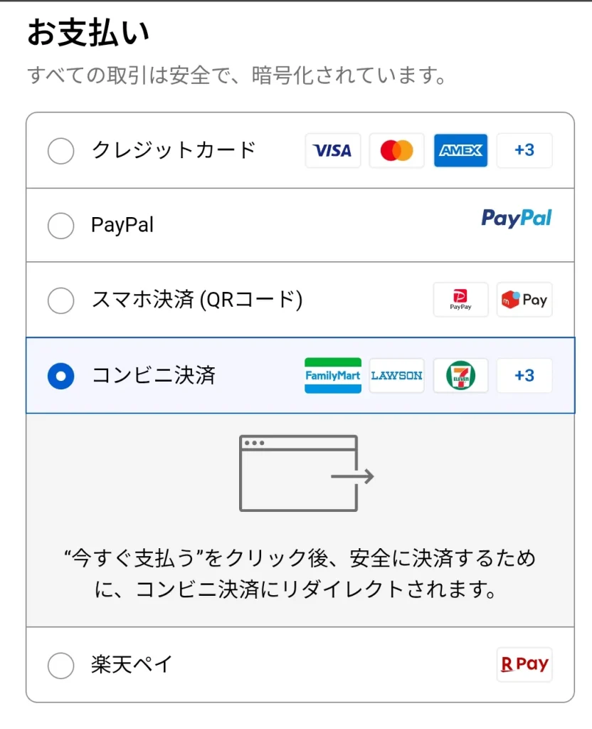 お支払い方法の一覧から「コンビニ決済」を選択、画面下にスクロールしていき「今すぐ支払う」ボタンをクリックします。