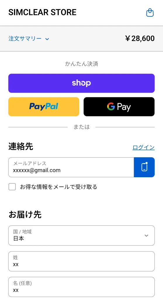 SIMCLEAR公式オンラインストアでは、「PayPal(ペイパル)」をはじめ、「Shop Pay」や「Apple Pay」「Google Pay」などのかんたん決済をご利用いただけます。