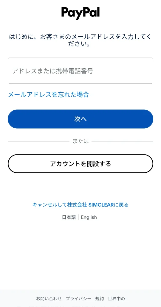 PayPalの場合は、登録しているメールアドレスまたは携帯番号を入力し「次へ」をクリックします。