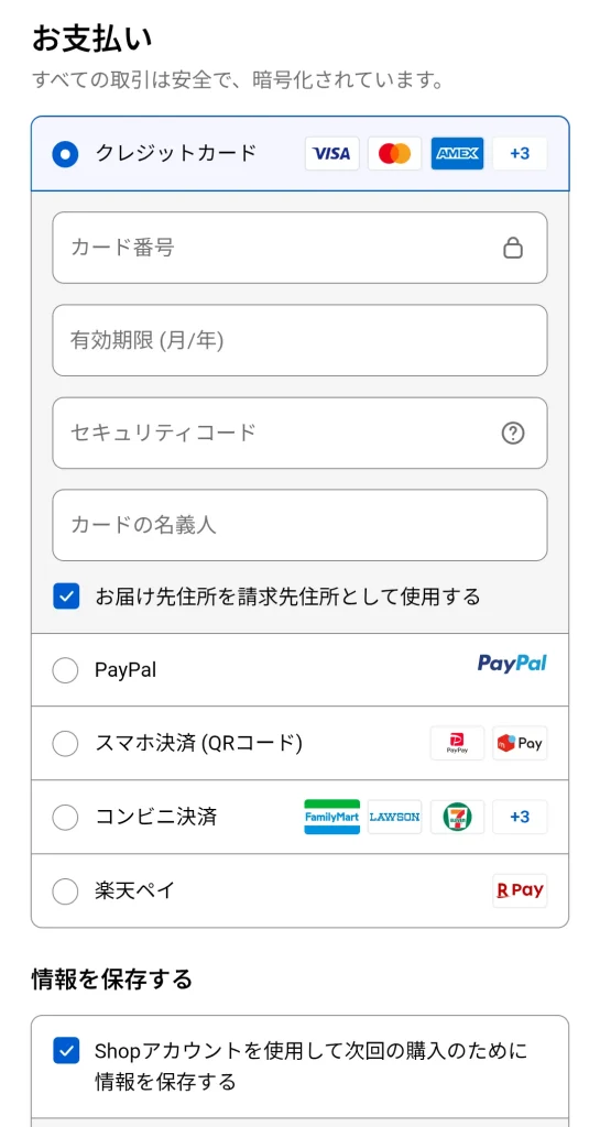 PayPalの場合は、登録済みのクレジットカードまたは銀行口座から引き落としが行われ、Shop Pay・Google Payの場合は、アカウントに登録済みのカード情報が自動的に使用されます。