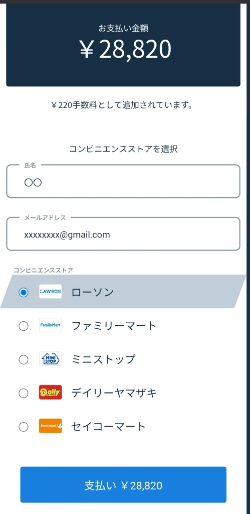 - ご希望のコンビニエンスストアを選択(例:ローソン・ファミリーマートなど)
